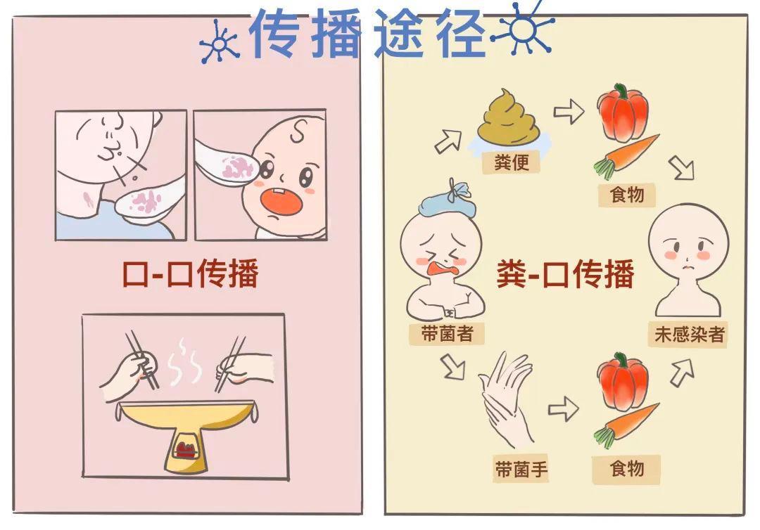 口-口授播(比如共用餐具、给孩子喂饭)粪-口授播(卫生风俗差)密切生计搏斗